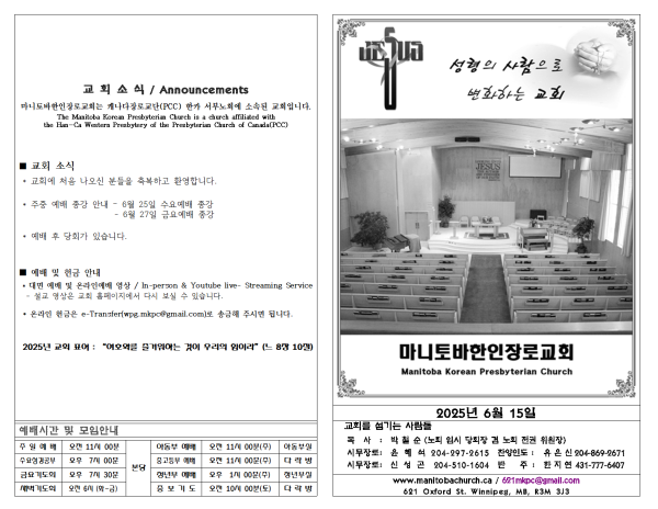 마니토바한인장로교회 웹사이트에 방문해 주셔서 감사합니다.