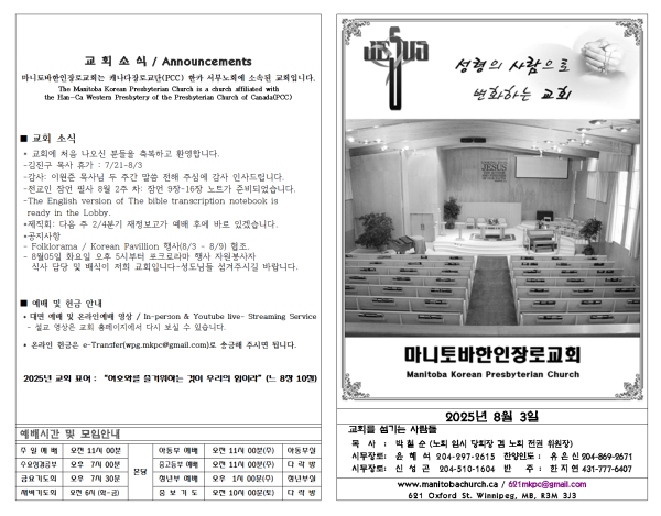 마니토바한인장로교회 웹사이트에 방문해 주셔서 감사합니다.