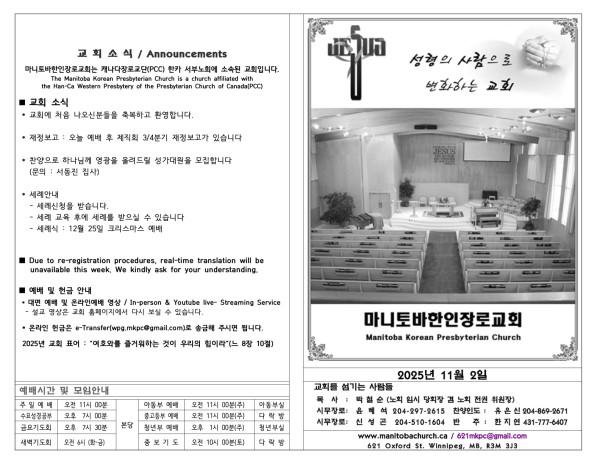 마니토바한인장로교회 웹사이트에 방문해 주셔서 감사합니다.