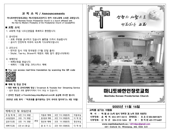 마니토바한인장로교회 웹사이트에 방문해 주셔서 감사합니다.