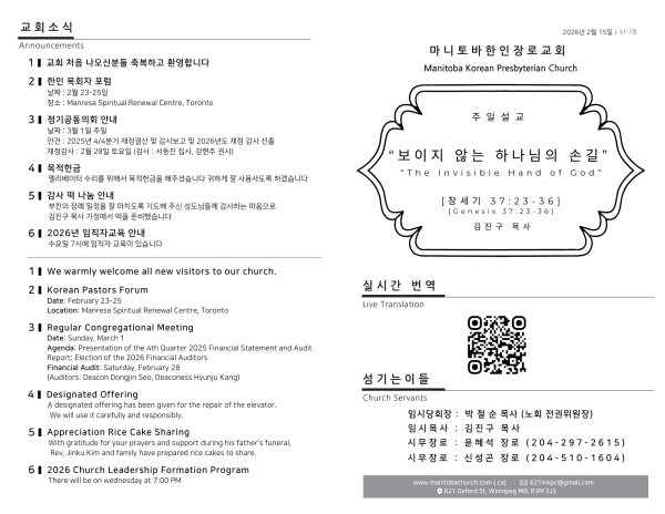 2026. 2. 15 주일예배 영상 및 주보