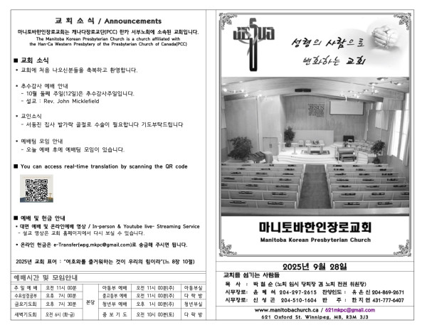 마니토바한인장로교회 웹사이트에 방문해 주셔서 감사합니다.