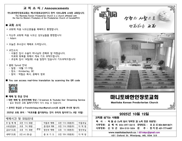 마니토바한인장로교회 웹사이트에 방문해 주셔서 감사합니다.