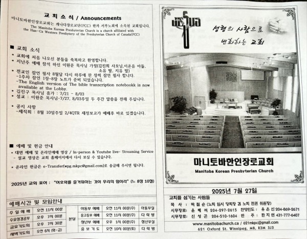마니토바한인장로교회 웹사이트에 방문해 주셔서 감사합니다.