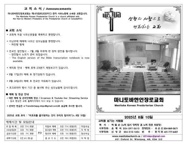 마니토바한인장로교회 웹사이트에 방문해 주셔서 감사합니다.
