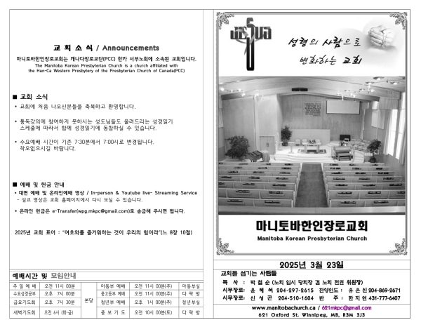 마니토바한인장로교회 웹사이트에 방문해 주셔서 감사합니다.