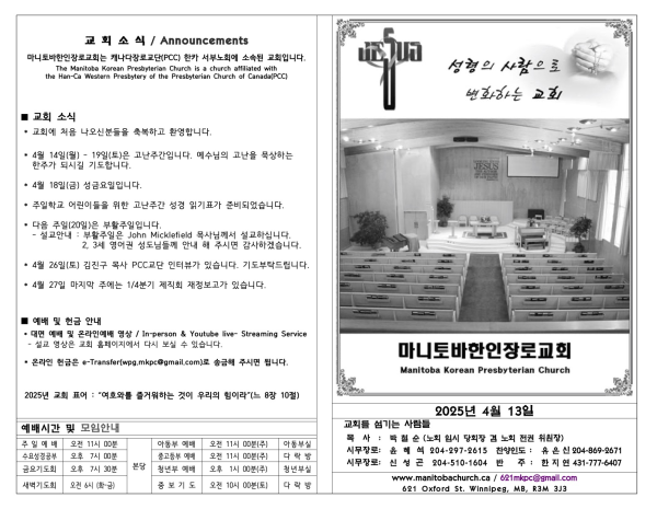 마니토바한인장로교회 웹사이트에 방문해 주셔서 감사합니다.