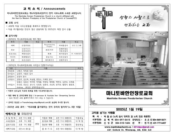마니토바한인장로교회 웹사이트에 방문해 주셔서 감사합니다.