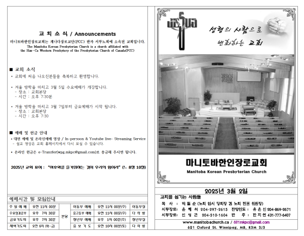 마니토바한인장로교회 웹사이트에 방문해 주셔서 감사합니다.