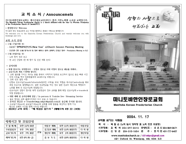 마니토바한인장로교회 웹사이트에 방문해 주셔서 감사합니다.