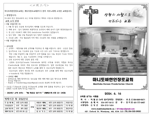 마니토바한인장로교회 웹사이트에 방문해 주셔서 감사합니다.