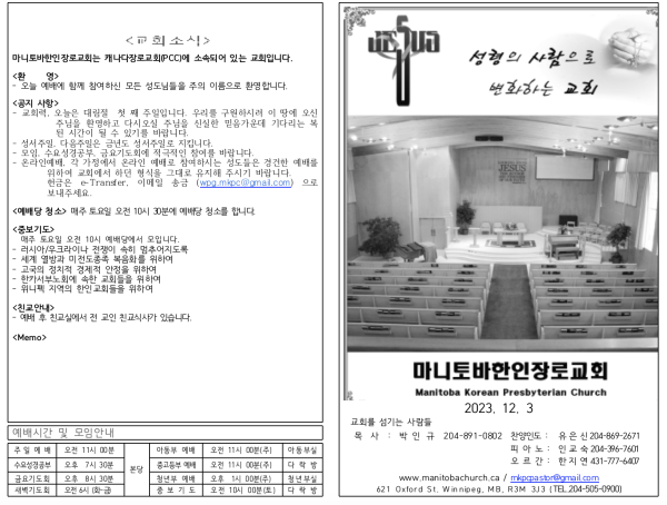 마니토바한인장로교회 웹사이트에 방문해 주셔서 감사합니다.
