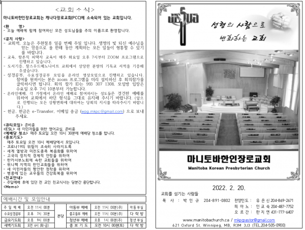마니토바한인장로교회 웹사이트에 방문해 주셔서 감사합니다.