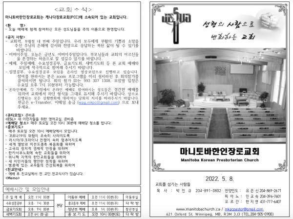 마니토바한인장로교회 웹사이트에 방문해 주셔서 감사합니다.