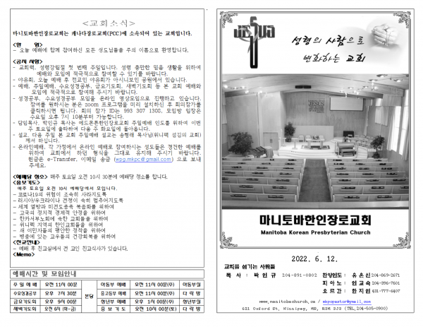 마니토바한인장로교회 웹사이트에 방문해 주셔서 감사합니다.