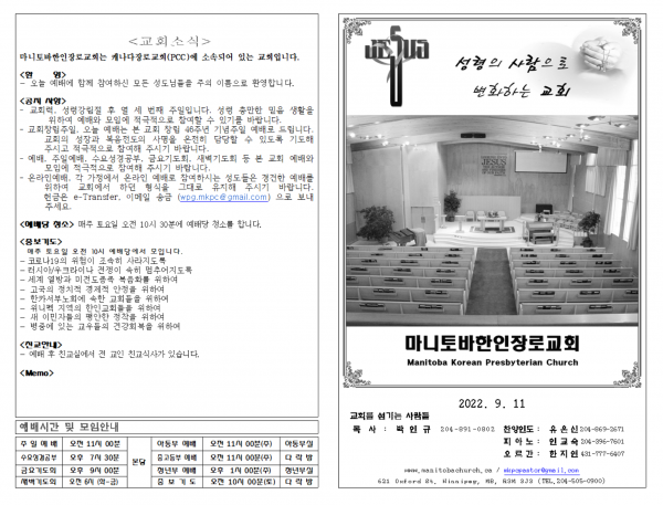 2022. 9. 11 주일예배 영상 및 주보