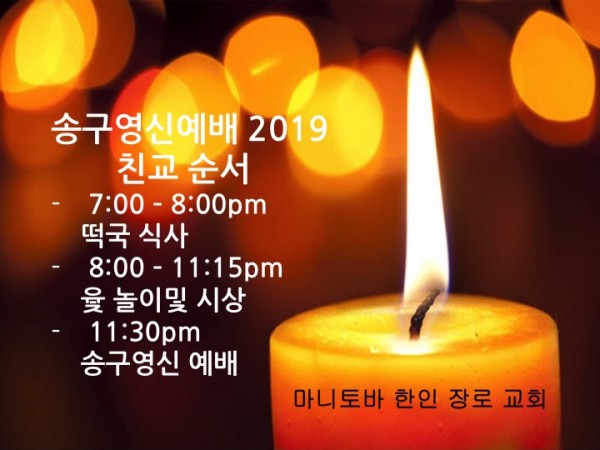 2019년도 12월31일 송구영신예배을 통해 함께하는 기쁨으로 보내는 시간과 맞이하는 시간을 즐겁고, 회개 할 부분과 계획하시는 기도제목으로 첫 해 , 첫 시간을 통해 주님께 구하는 시간을 맞이합시다.