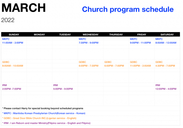저희 본 마니토바 한인 장로교회에서는 3월 부터 3개 교회들이 예배 처소을 함께 사용합니다.