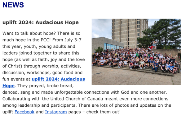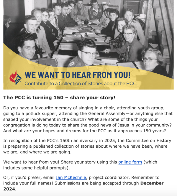 Do you have a favourite memory of singing in a choir, attending youth group, going to a potluck supper, attending the General Assembly—or anything else that shaped your involvement in the church? What are some of the things your congregation is doing today to share the good news of Jesus in your community? And what are your hopes and dreams for the PCC as it approaches 150 years?