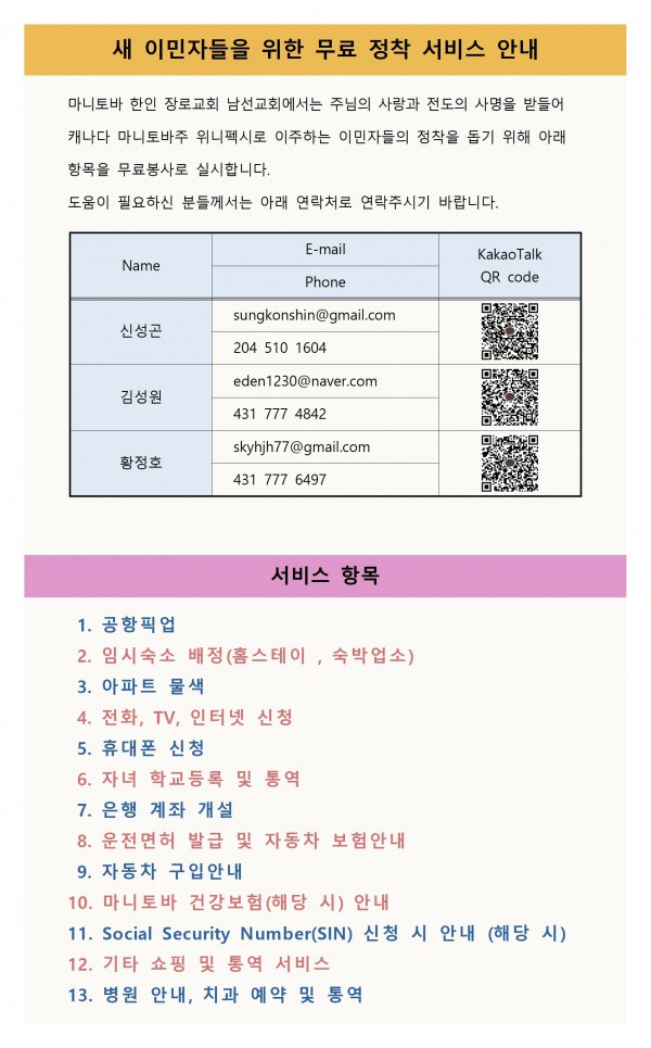 새 이민자들을 위하여 무료 정착 도우미 프로그램을 다음과 같이 추진하고자 합니다.